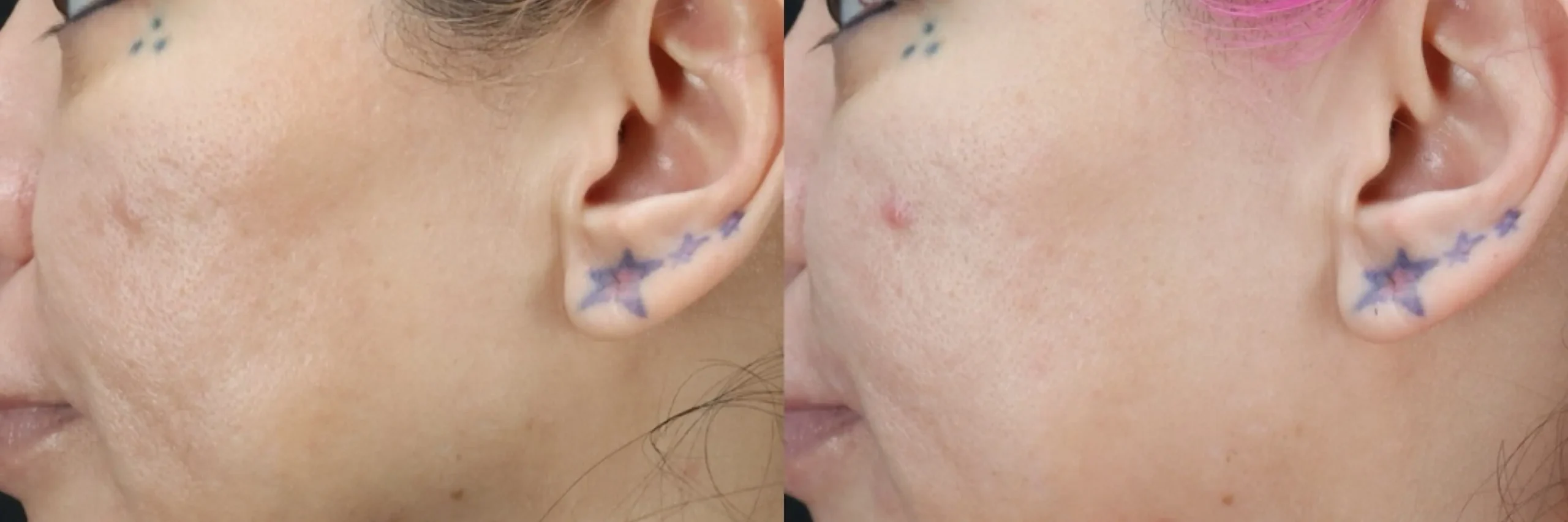 This patient received Sculptra to the cheeks to gradually build collagen and restore subtle volume, along with Skinvive to the cheeks to improve overall skin quality. At four weeks, her skin appears smoother and more radiant, with visible refinement in texture and a reduction in the appearance of pores and acne scars. The combination treatment enhanced both structure and luminosity, creating a naturally refreshed look. Her results will continue to improve over time as collagen production is stimulated for long-lasting, healthy-looking skin.