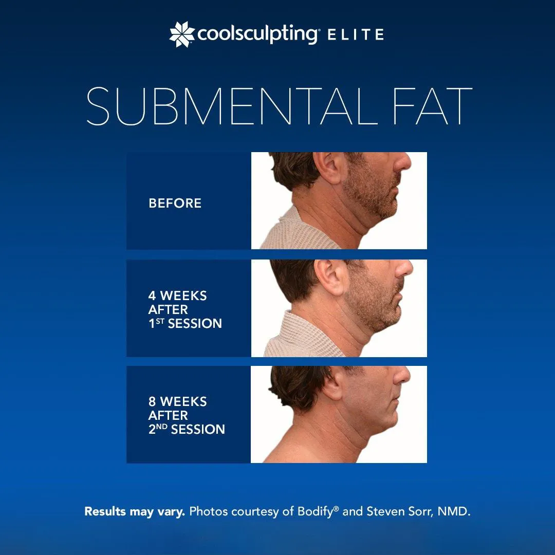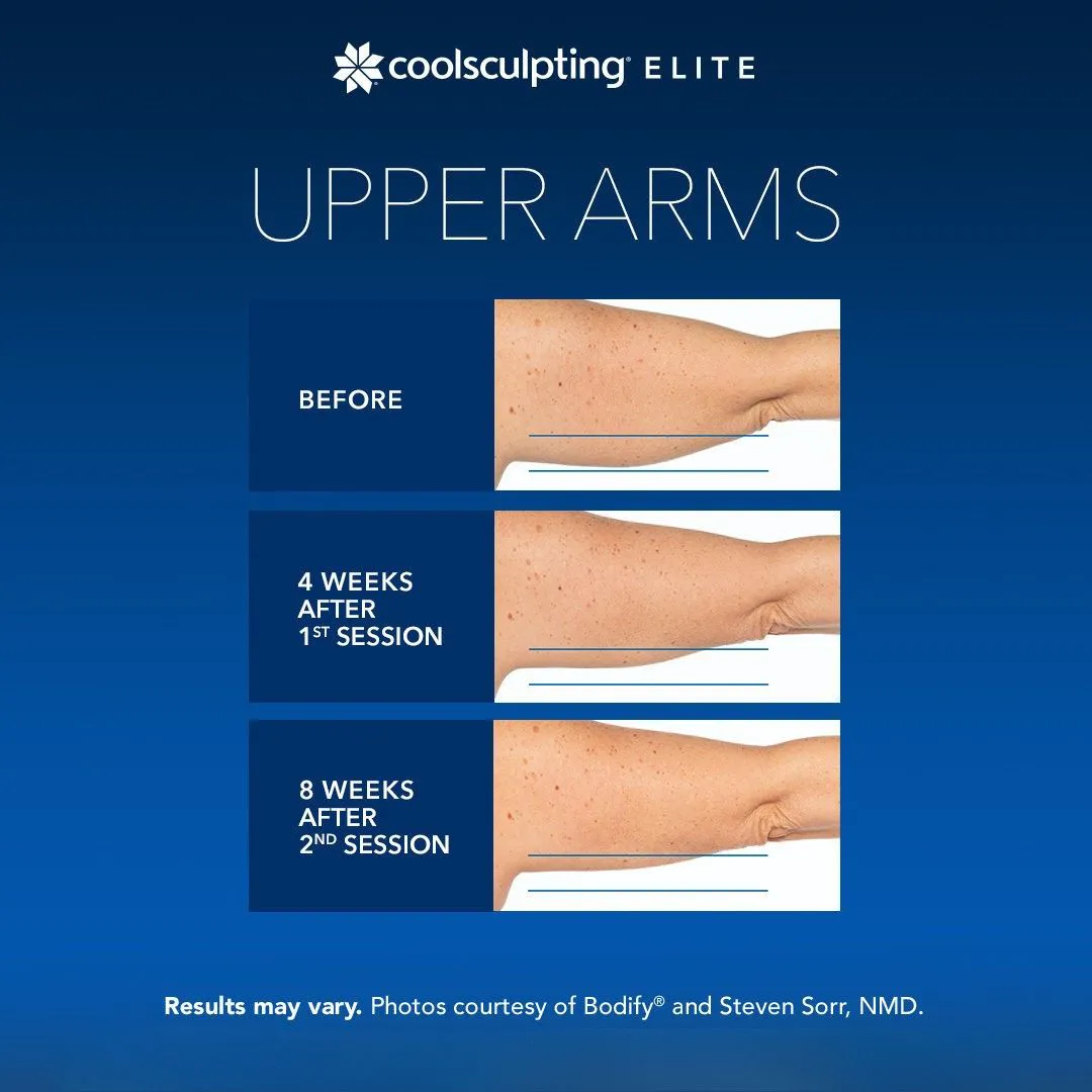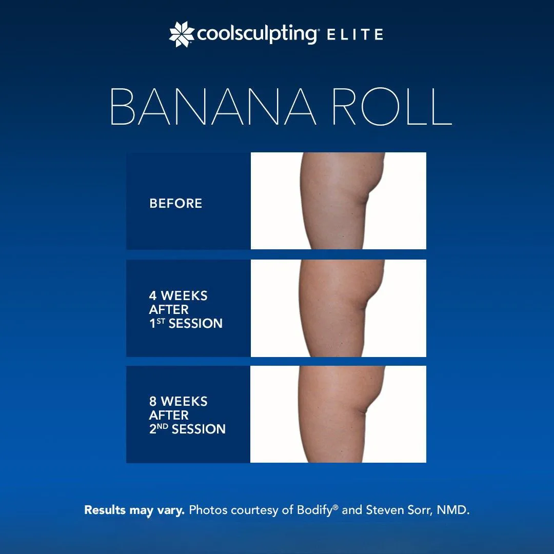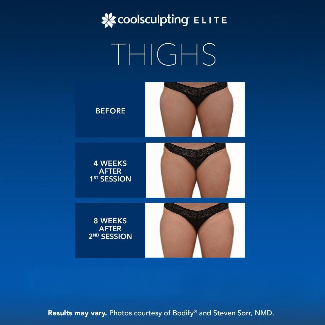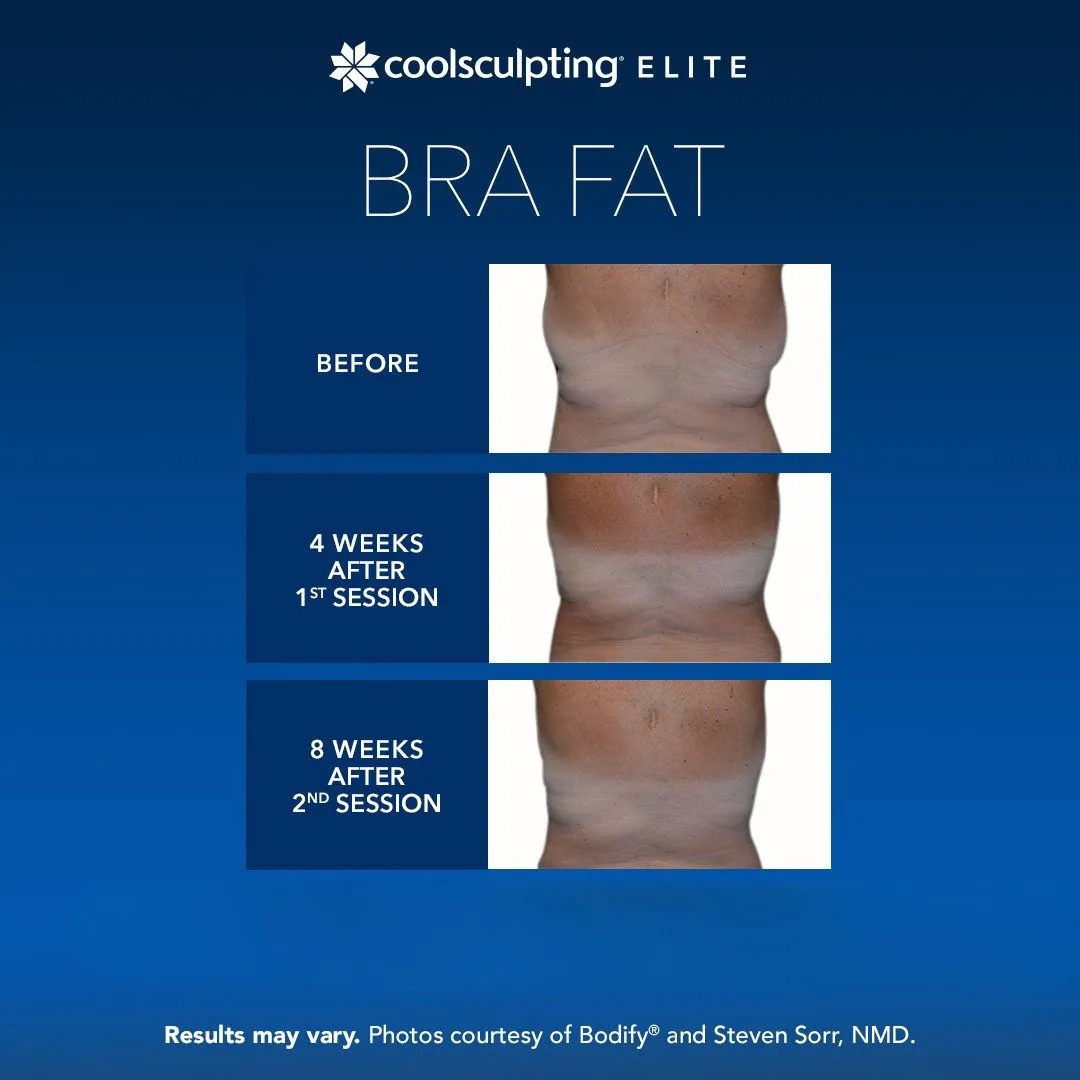 CoolSculpting Elite is FDA-approved for treating fat in the areas of the submental (under the chin), submandibular (under the jawline), thighs, abdomen, flanks, bra fat, back fat, underneath the buttocks (banana roll), and upper arm areas.